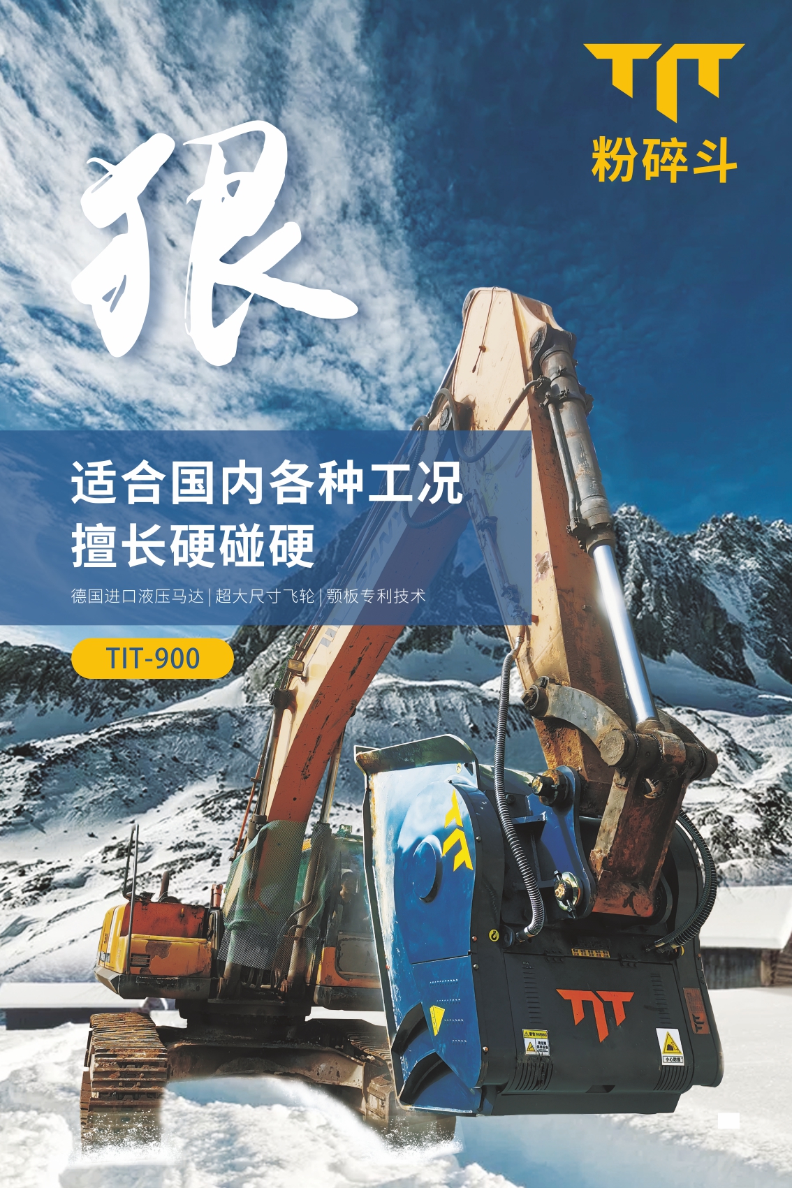 TIT粉碎斗也稱破碎斗,顎式破碎斗,是一款創新型挖掘機屬具,掛于挖掘機大臂上,可快速將工程惰性材料破碎成極具價值的工程用料。